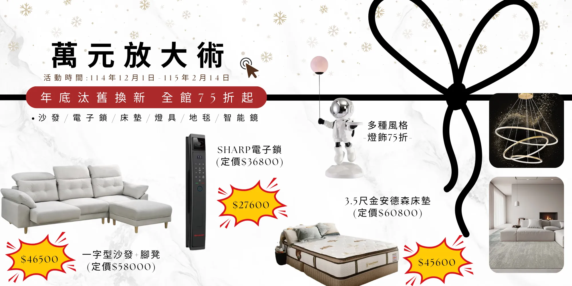 年底煥新換新家,一次打包SAKURA廚具、多功能台製沙發、設計師造型燈具、SHARP智能鎖、設計師選用地毯、智能化妝鏡、金安德森床墊