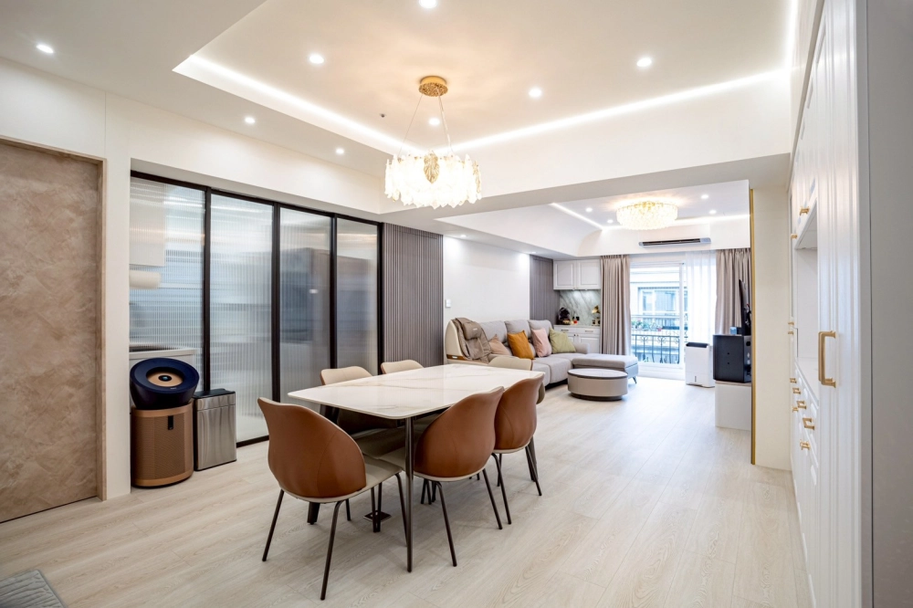 客廳以大器吊燈成為視覺中心,